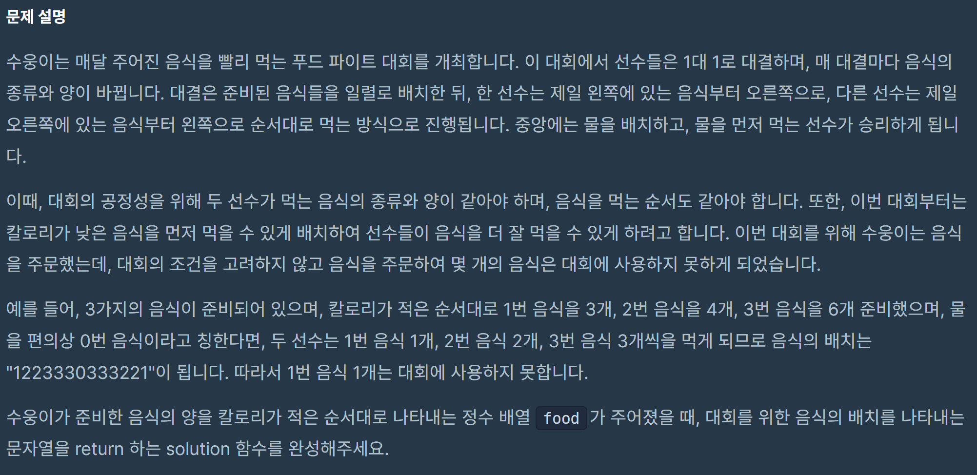 1. String 메서드의 repeat()활용해 2로 나눈 몫을 곱해준다(음식은 선수 2명에게 함께 주어져야 하므로 1개가 남으면 버림)